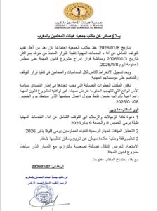- دعوة كافة الزميلات والزملاء إلى التوقف الشامل عن أداء الخدمات المهنية طيلة يومي الخميس والجمعة 8 و9 يناير 2026.
